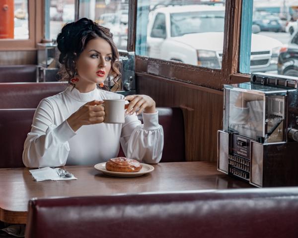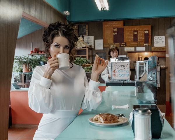 Between jeweled sparkle and diner porcelain, she shifts from silvered elegance to everyday ritual. Sequined nights give way to mornings with coffee and pastry, yet the poise never fades. Every glance carries both sophistication and steel—a reminder that beauty lives not just in polished moments, but in the quiet pauses between.
