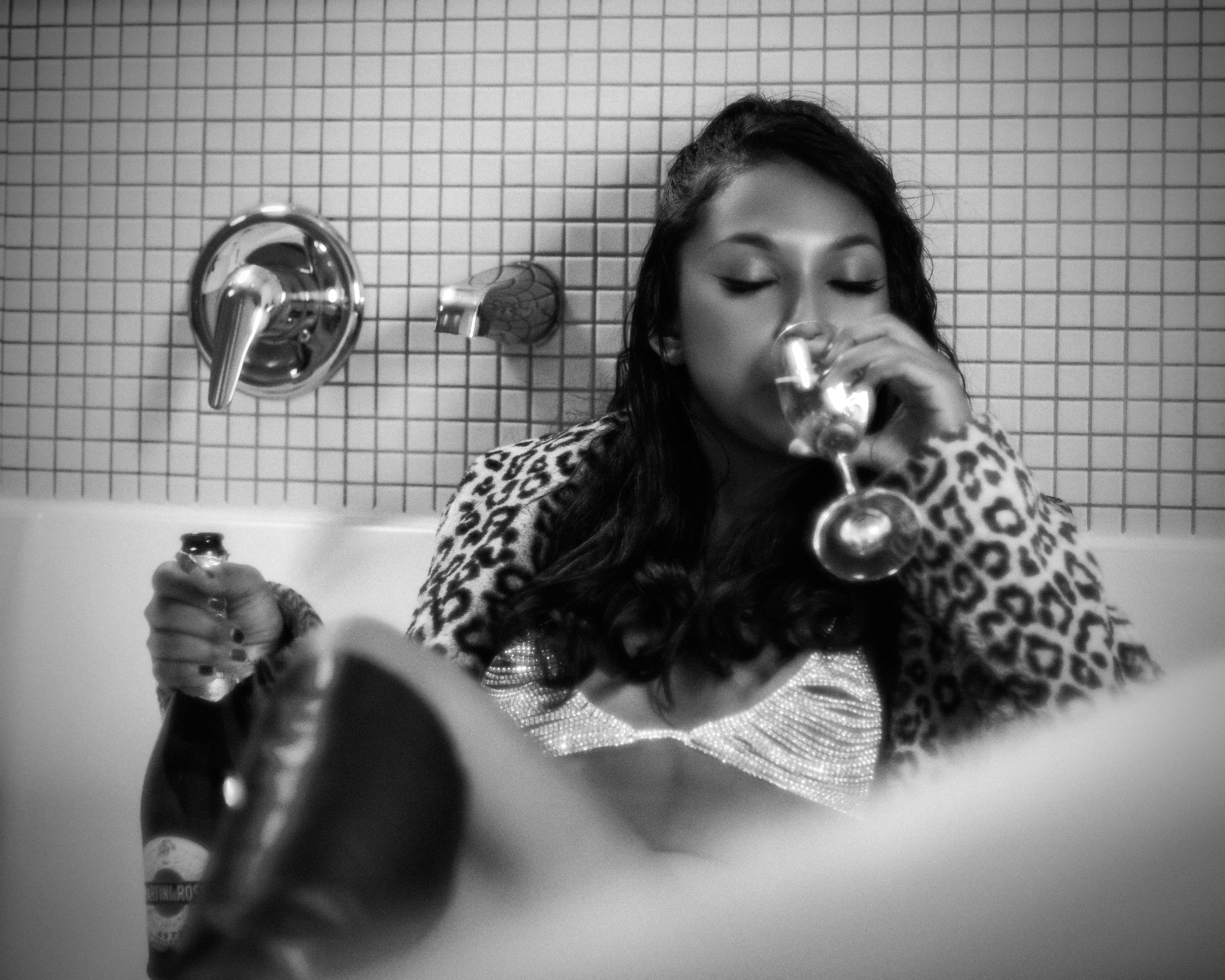 In the sterile glow of tile and porcelain, she turns the bathtub into a stage for excess and escape. Leopard print, glittering bra, and towering boots—her armor against the silence. A bottle in one hand, a glass in the other, she drinks to defiance, to heartbreak, to survival. Here, glamour and grit dissolve together, effervescent as champagne and heavy as the night that follows.
