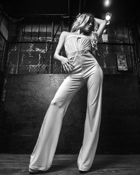 High above the city’s hum, she moves with the wind—a vision in white, in stripes, in shadows of noir. Concrete and steel bow to her presence, every rooftop beam a stage, every skyward gaze a hymn. She is strength in silhouette, poise carved in sunlight and shadow, dancing between elegance and edge.