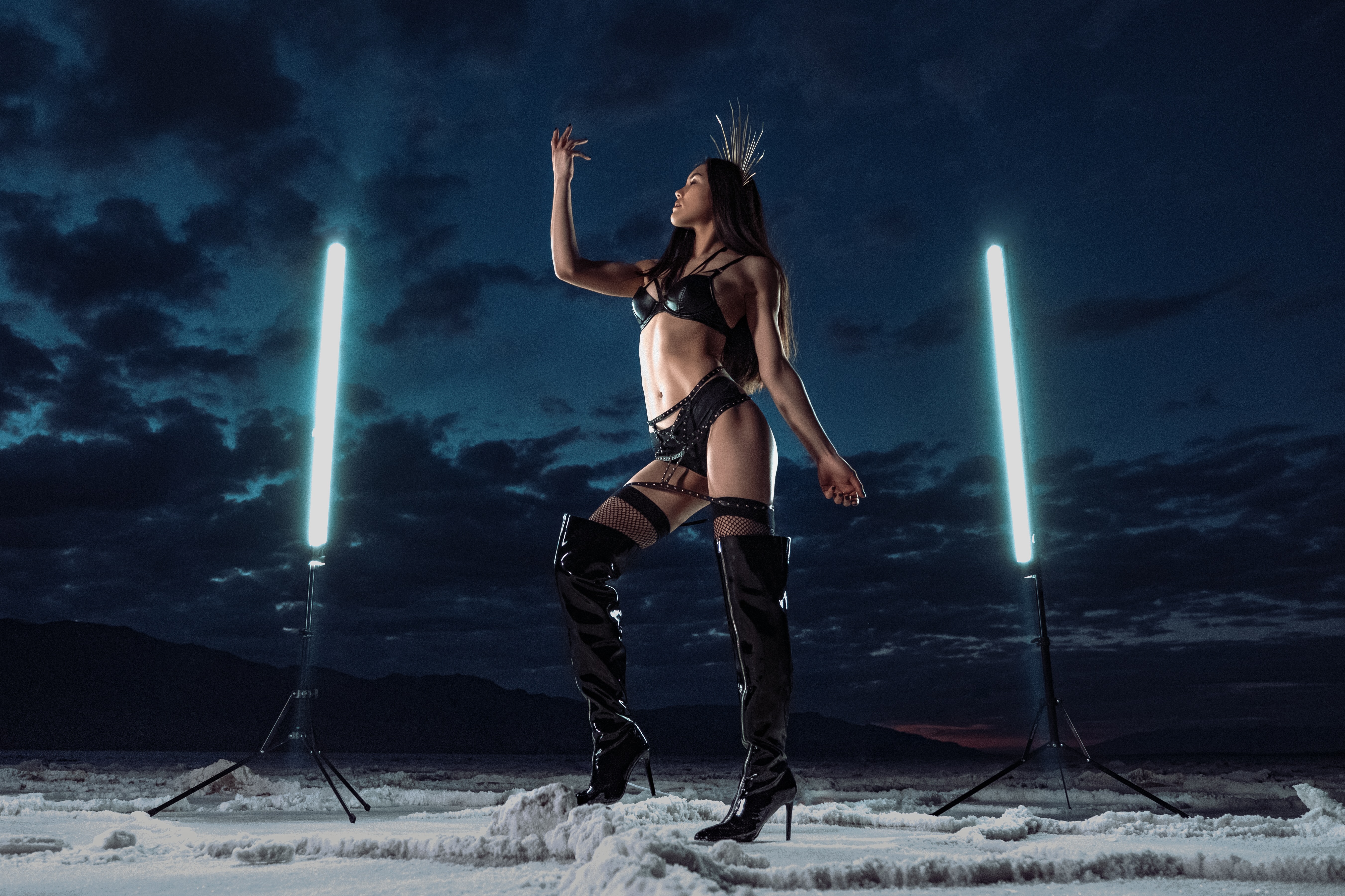 Beneath a storm-stained twilight, she rises from the salt flats like a celestial queen—crowned in light, armored in leather and lace, poised between earth and cosmos. Each pose is a prayer and a defiance, a declaration of power against the vast horizon. This is a portrait of strength wrapped in starlight, where the barren ground becomes a throne and the night sky her cathedral.