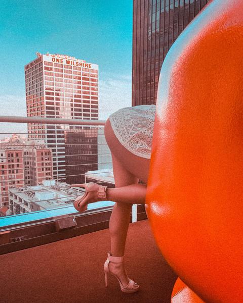 Perched above the city, she lingers where glass towers meet painted skies. Lace and heels against steel and neon, she is both softness and steel—gazing out, leaning in, caught between the skyline’s expanse and her own quiet allure. Every glance becomes a horizon, every pose a promise that the city keeps only at dusk.