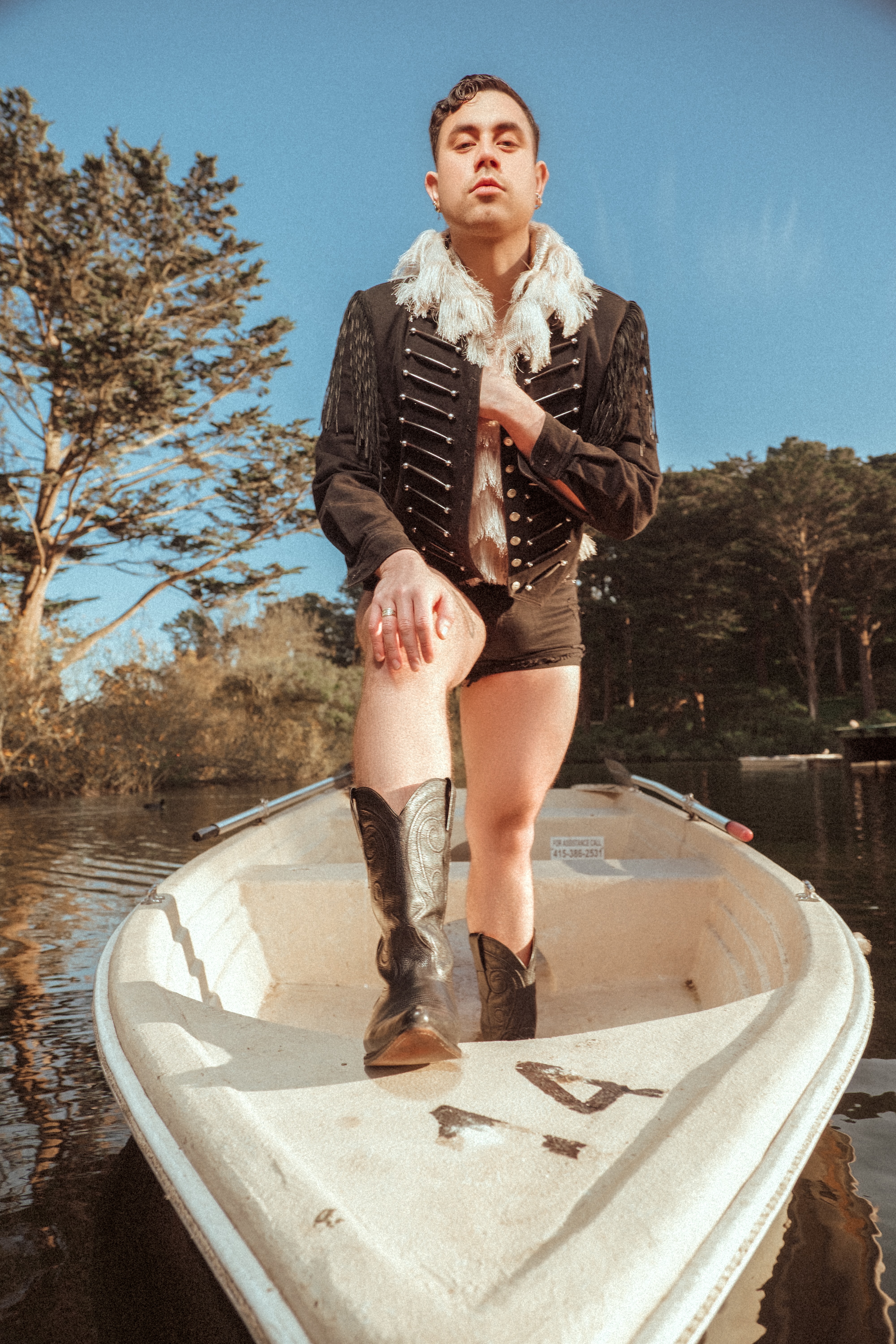 Between sunlight on the lake and shadows underground, he shifts from dandy voyager to fierce raconteur. Cowboy boots on a rowboat, velvet coats and sharp suits—each look a performance, each gesture a proclamation. His presence is a tide, pulling us between play and power, between costume and conviction, until the line between theater and truth disappears.