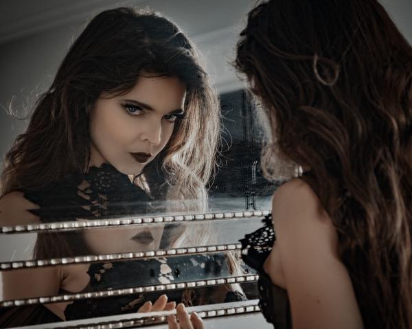 Between reflection and reality, she lingers—half hidden, half revealed. A gaze softened by shadows, a smile caught between knowing and secret, she becomes both muse and mystery. Lace, mirrors, and velvet eyes weave a story of intimacy, where beauty leans into silence and desire speaks without words.